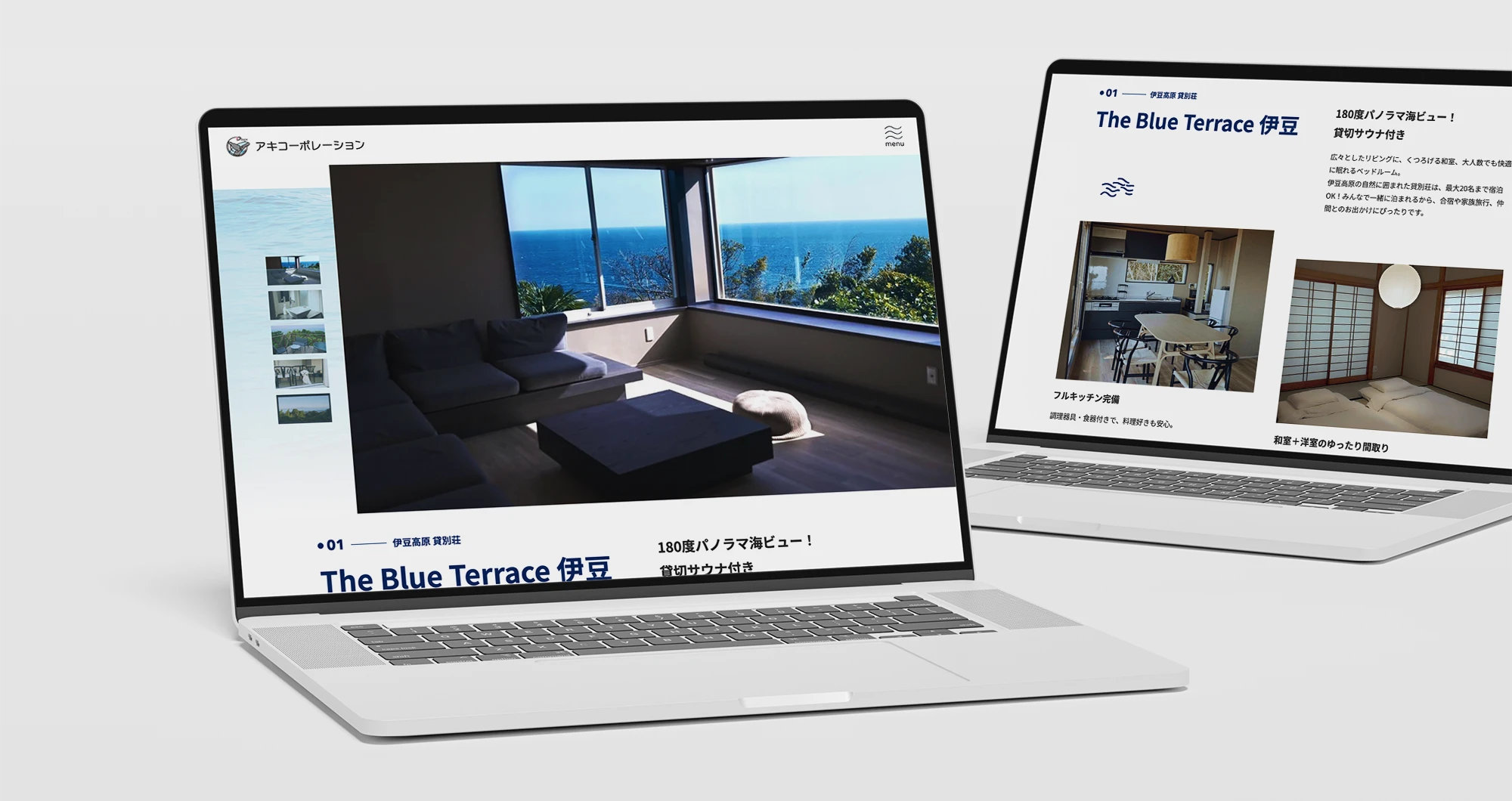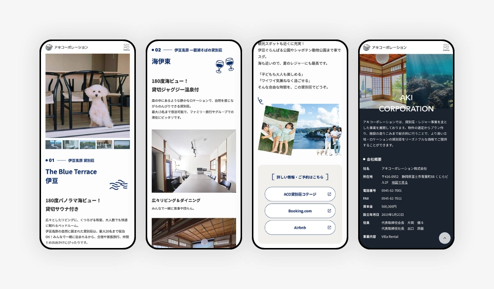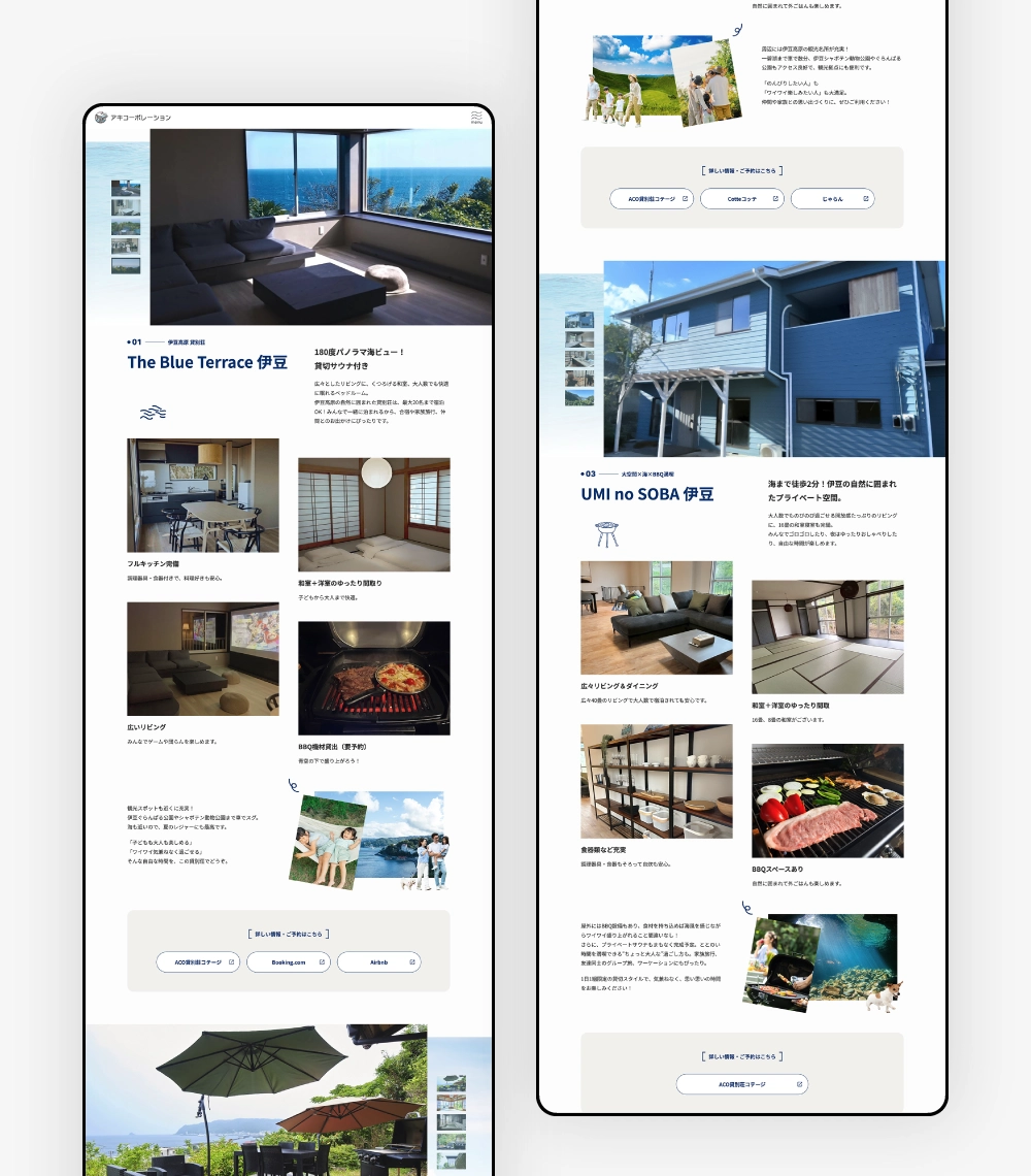 貸別荘サービスを主とする企業のコーポレートサイト。物件の一覧性と詳細情報のバランスを最適化しました。企業の専門性とスピード感を伝えるビジュアルを採用し、地域のお客様が安心して相談できるパートナーとしてのイメージを構築しています。